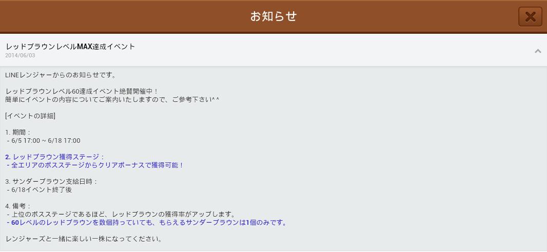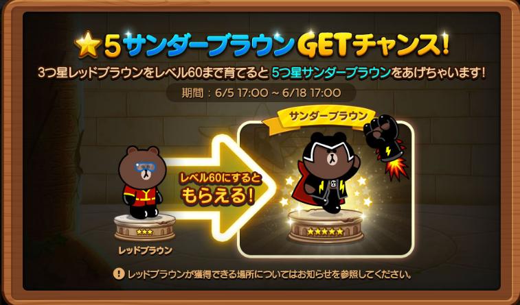 イベントです! レッドブラウンをレベル60にするとサンダーブラウンがもらえる!! レベル60ってことは・・5匹集めてMAX合成すればOK 期間中(6/5~6/18)はどこの赤ステージでもレッドブラウンがドロップするみたいです。 非課金の低レベルプレイヤーにはレッドブラウンが手に入るだけでも うれしいですね。